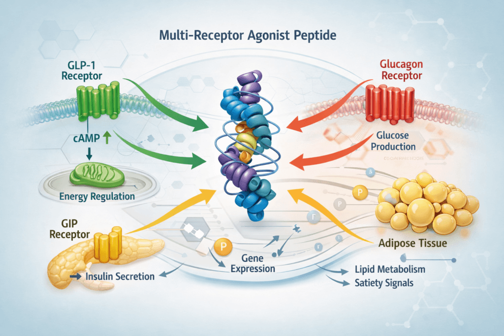 Metabolic signaling involves overlapping systems rather than one isolated line of communication. Receptor activation may connect with intracellular messenger pathways, endocrine network activity, adipose-related communication, and energy-regulation mechanisms within the same broader framework. Multi-receptor agonist research is valuable because it allows these overlapping systems to be examined with greater integration. Rather than separating each pathway question into a different model, researchers can evaluate how several receptor pathways may interact within one peptide design.